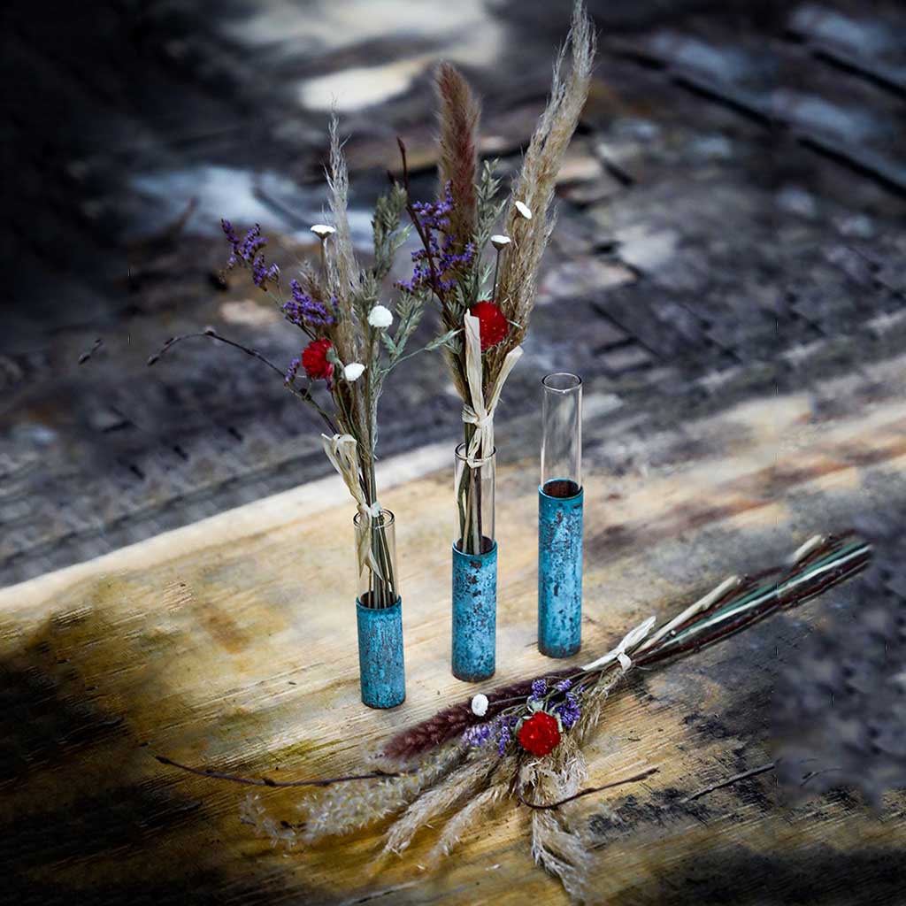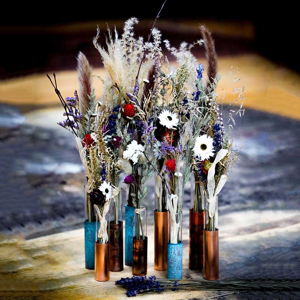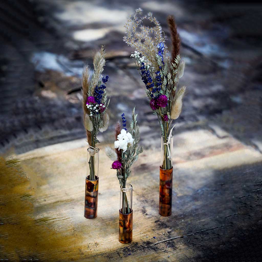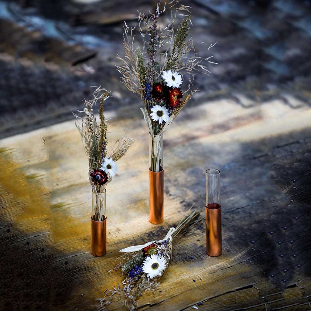 Introducing our new range of copper flower/bud vases. Each vase is made from a piece of recycled copper and glass test tubes that are salvaged from an old medical laboratory. Making these pieces 100% recycled! The copper comes in 3 finishes: plain copper, marbled copper and patina copper.