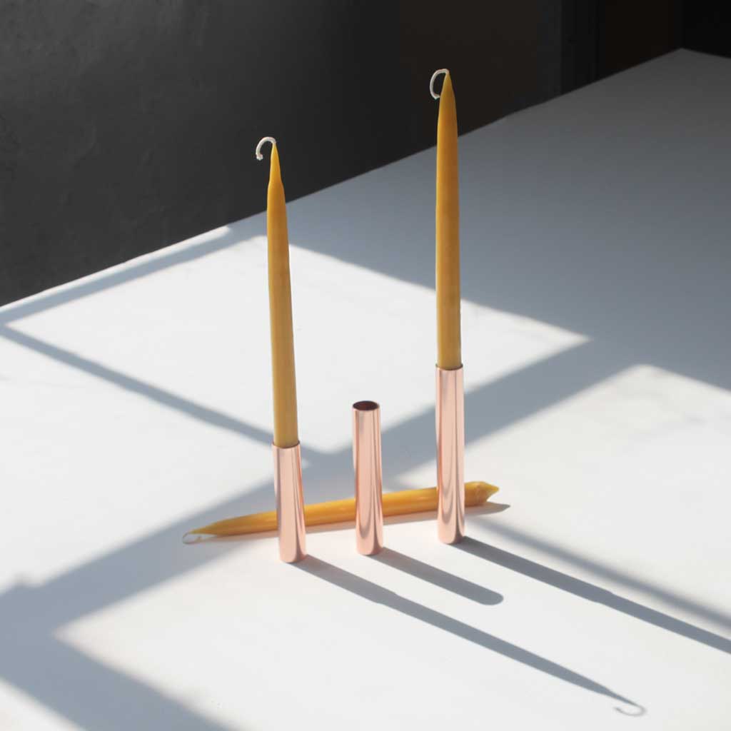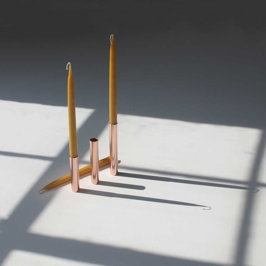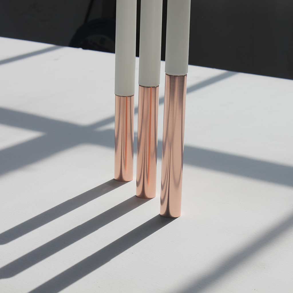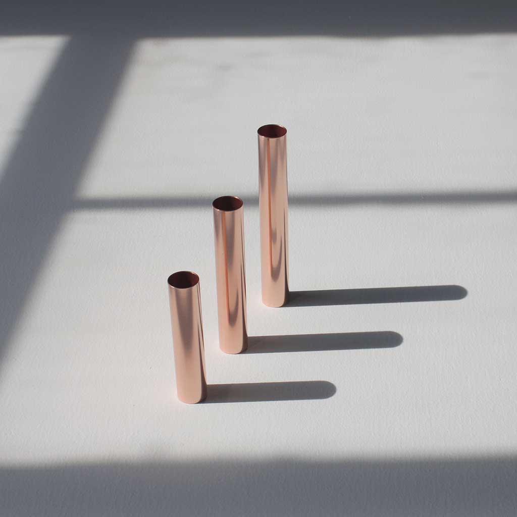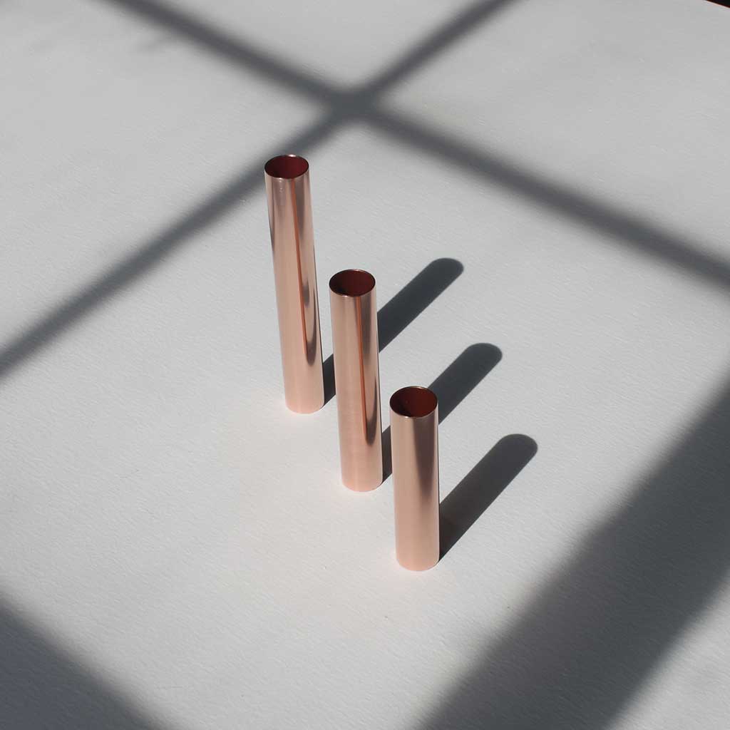 Illuminate your space with the sophisticated charm of TriLine, a striking set of three candle holders that effortlessly blend modern elegance with minimalist design. Each piece is meticulously crafted and hand polished from recycled copper pipes, showcasing clean, linear forms that capture and reflect light with understated brilliance.