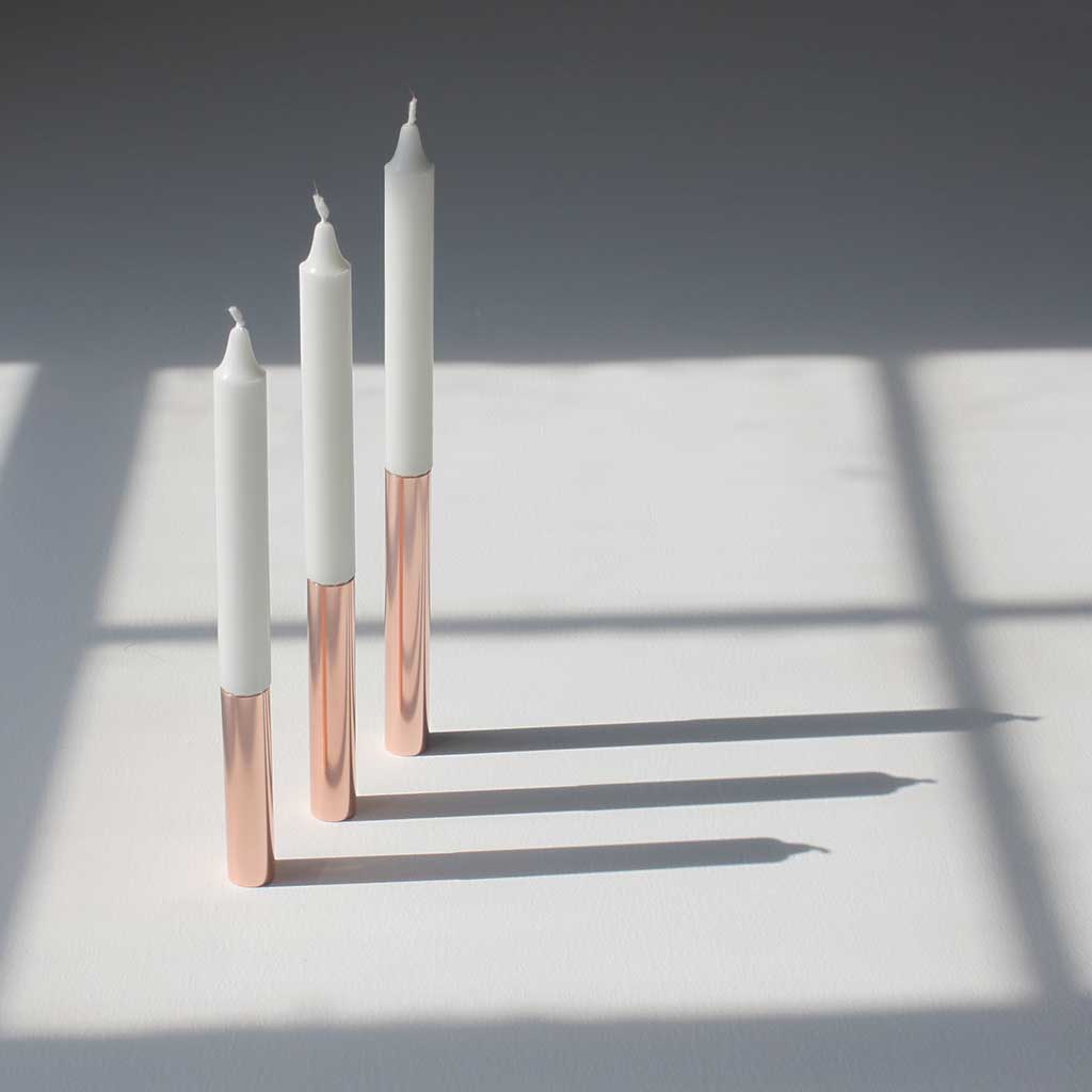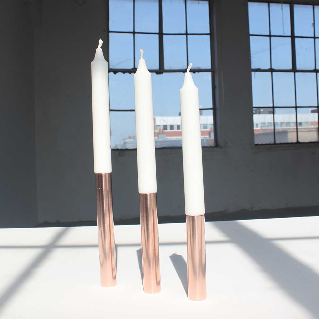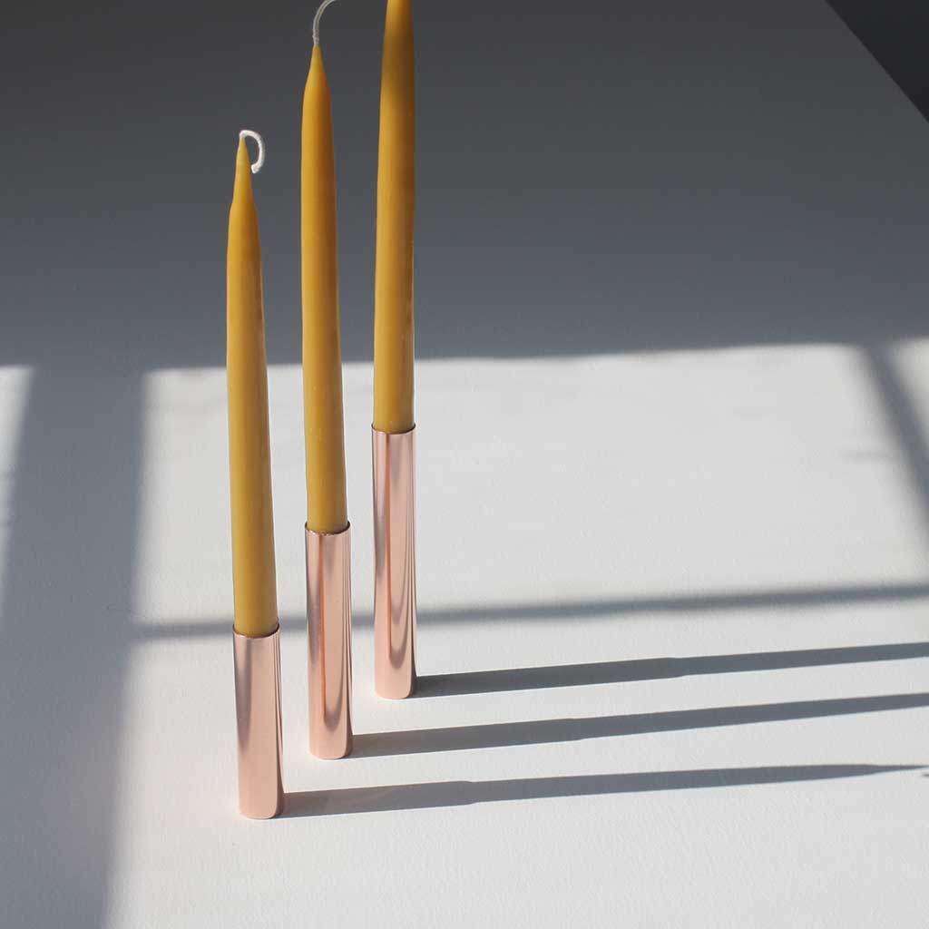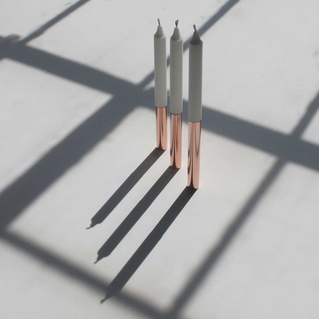 Illuminate your space with the sophisticated charm of TriLine, a striking set of three candle holders that effortlessly blend modern elegance with minimalist design. Each piece is meticulously crafted and hand polished from recycled copper pipes, showcasing clean, linear forms that capture and reflect light with understated brilliance.