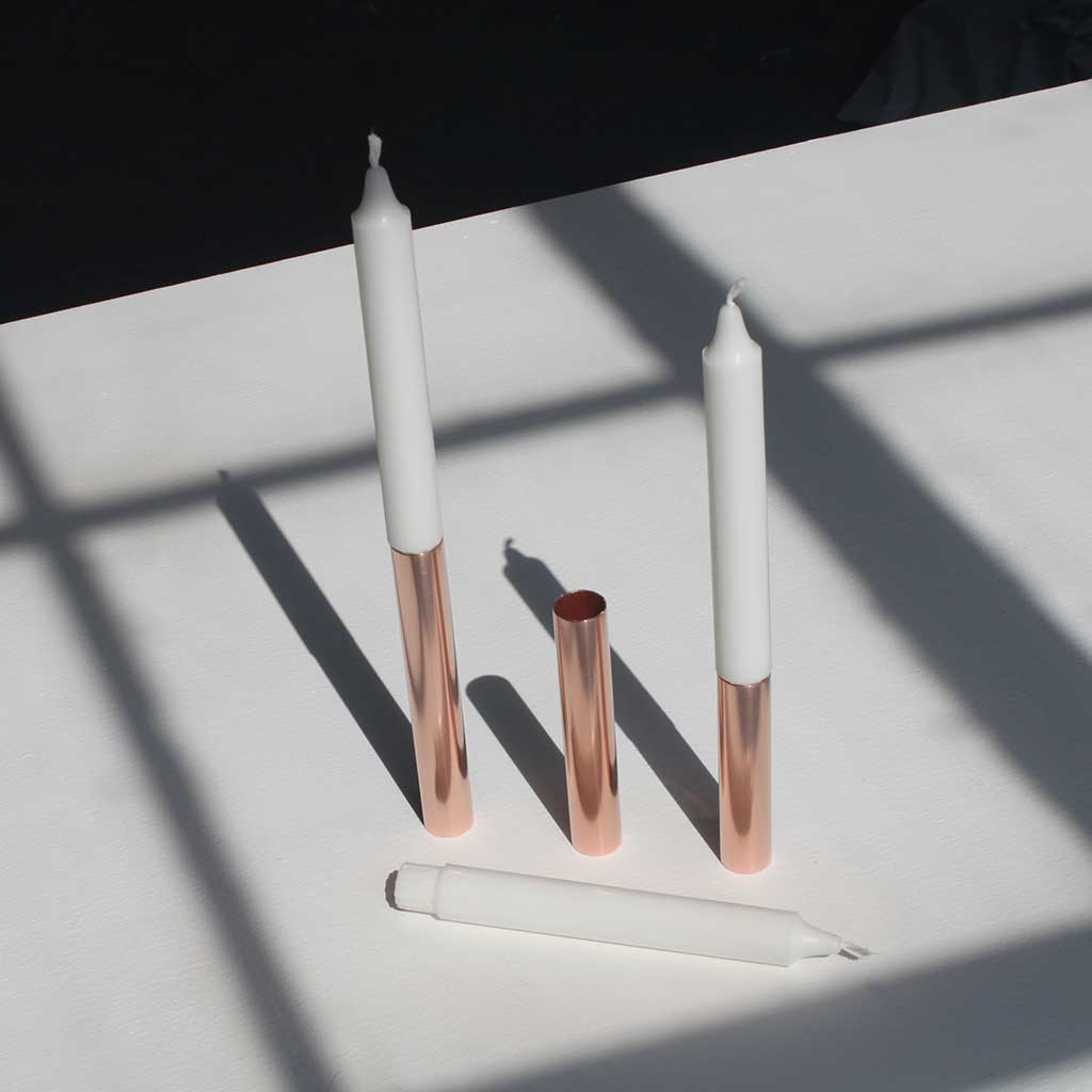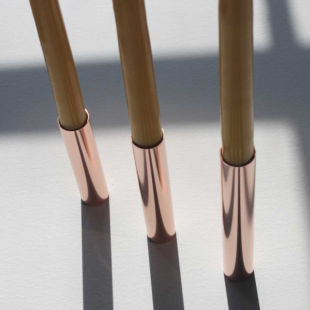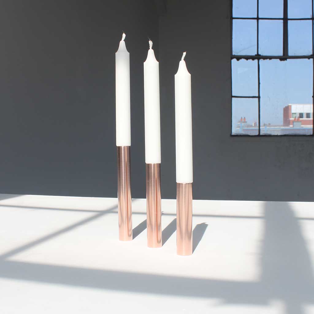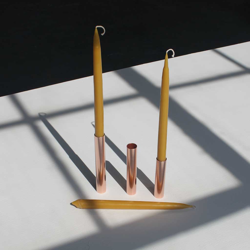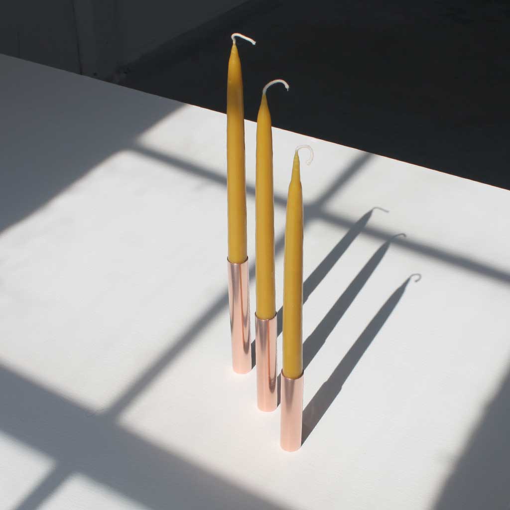 Illuminate your space with the sophisticated charm of TriLine, a striking set of three candle holders that effortlessly blend modern elegance with minimalist design. Each piece is meticulously crafted and hand polished from recycled copper pipes, showcasing clean, linear forms that capture and reflect light with understated brilliance.